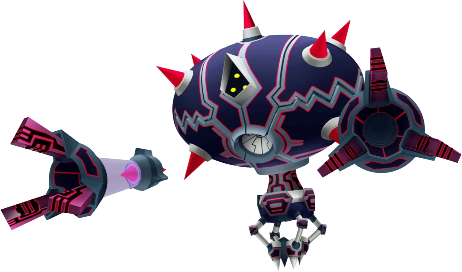 Die Arme sind nicht mit dem Körper verbunden und schweben stattdessen an seinen Seiten. Seine Arme sind lichtdurchlässige, violette Röhren mit rosanen Stacheln in ihnen. Die Enden sind grau und durch das indigoblaue und rote Schaltsystem verziert. Beide Hände haben drei rosafarbige abgeschrägte kantige Finger mit schwarzen und roten Schaltungen.