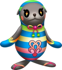 Er ähnelt von seiner Gesamterscheinung her, einem kleinen Seelöwen. Sein Fell ist im Gesicht in einem hellen grau getönt, während es am restlichen Körper grau getönt ist. Seine Augen sind kreisrund und schwarz und haben eine sternförmige gelbe Pupille. Die kleine Nase auf seiner Schnauze ist schwarz getönt. Seine beiden Arme und Beine haben die Form einer Schwimmflosse. Im Bauchbereich befindet sich ein rotes Geist Traumfänger-Symbol. Als Bekleidung trägt er mehrfarbig gestreiften Ganzkörperanzug, der den vorderen Bereich seines Kopfs unbedeckt lässt, sowie Extremitäten. Seine Wangen sind mit einem orange farbigen Kreis verziert. Um seinen kurzen Hals trägt er eine gebundene Schleife mit zwei angehängten Glöckchen. Der untere Bereich seiner Armflosse ist blau getönt und am unteren Bereich seiner Beinflossen trägt er jeweils eine angedeutete T-förmige rosa farbige Verzierung, die insgesamt wie der Riemen einer Sandale aussieht.