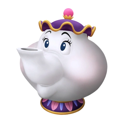 La maldición transformó a la Sra. Potts en una tetera grande y blanca. Ella tiene ojos verde azulados y las cejas finas y negras. Su base es de color púrpura con revestimiento de oro y un patrón claro, rosa y azul alternando en ella. La tapa de la cabeza es de color púrpura con bordes ondulados y el revestimiento es de oro. El mango es una bola de color rosa que está en la parte superior de la tapa. Aunque nunca se muestra su figura humana en Kingdom Hearts, en la película de La Bella y la Bestia se revela que ella era una mujer mayor, de baja estatura, rechoncha, y que llevaba un traje de sirvienta rosa.