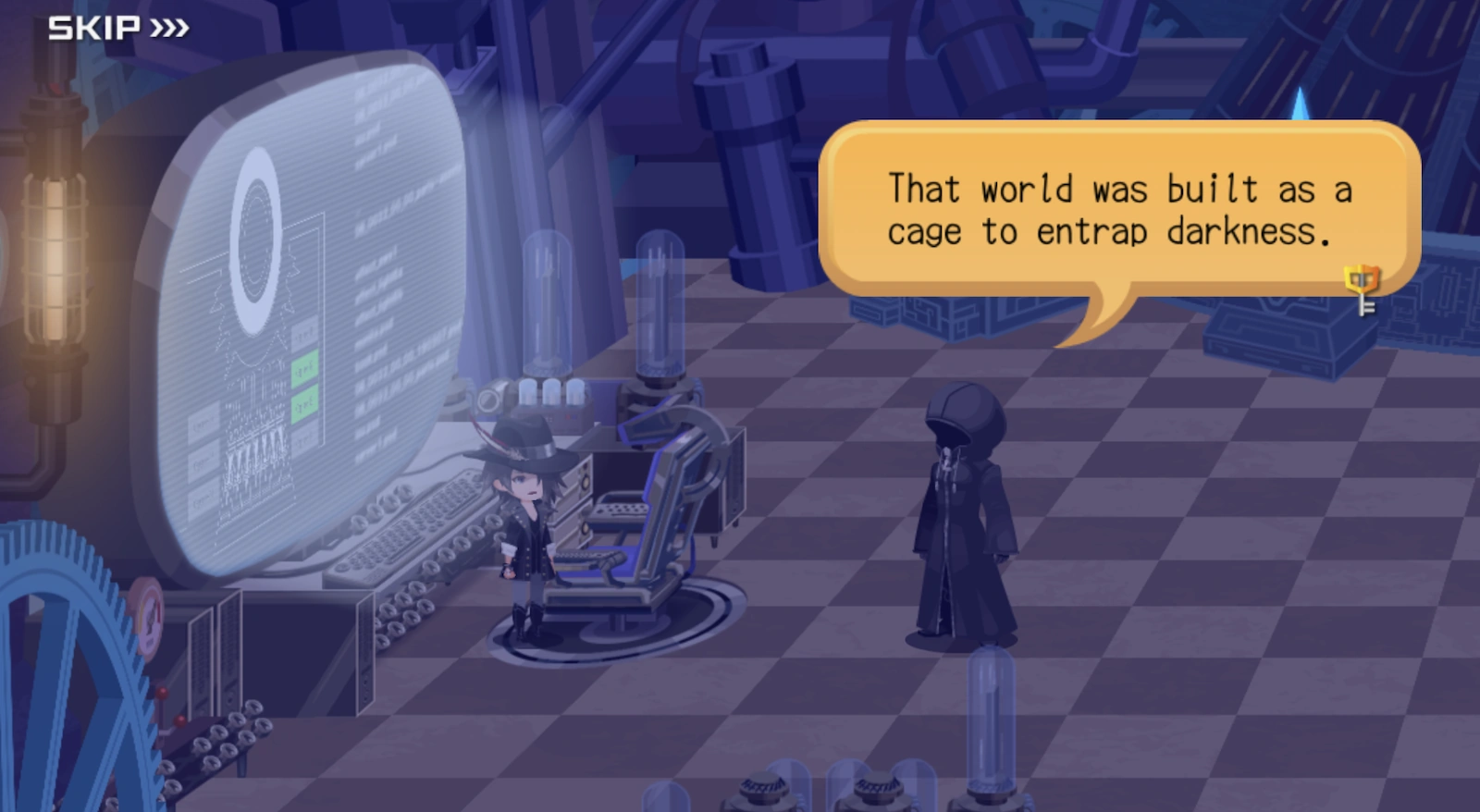 Dans le monde de données, Ephemer et Skuld montent à bord des capsules revenues du monde réel et repartent en l'absence du Joueur. Le portail ouvert par Ephemer a en réalité transporté le Joueur et les ténèbres à Game Central Station. Il s'avère que le Joueur a dupé les quatre Ténèbres, qui s'attendaient à pouvoir infecter d'autres mondes grâce à la possession du porteur de la Keyblade. Refermant le portail d'Ephemer de l'autre côté, il se condamne ce faisant avec les Ténèbres à l'intérieur du monde de données.