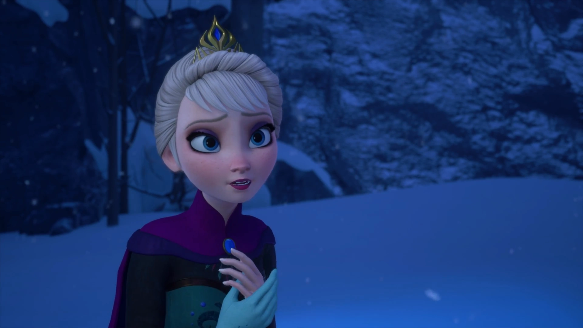 En escaladant les falaises des montagnes enneigées pour rattraper Anna et les autres, le trio arrive une nouvelle fois à la montagne du Nord et au palais de glace d'Elsa. À l'intérieur du palais, Anna parle à Elsa dans l'espoir de mettre fin à l'hiver éternel, mais Elsa continue d'insister sur son incapacité à contrôler ses pouvoirs. Elsa perd le contrôle et frappe accidentellement Anna avec sa magie de glace. Sora, à l'extérieur du palais, ressent cela avec douleur dans son cœur et pense qu'il s'est passé quelque chose de terrible dans le palais.