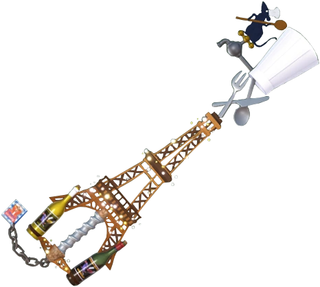 La pointe de la Keyblade est couverte par une toque de chef cuisinier, et le panneton est formé de l'enseigne du restaurant Ratatouille fondé par Petit chef et Linguini dans le film Ratatouille.