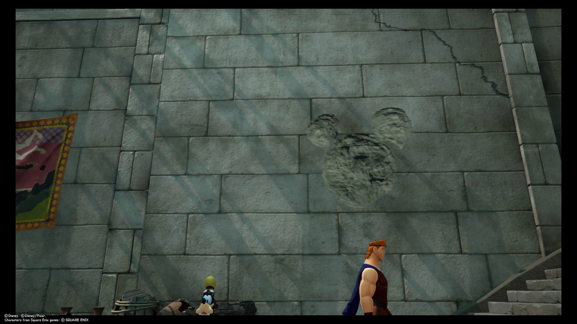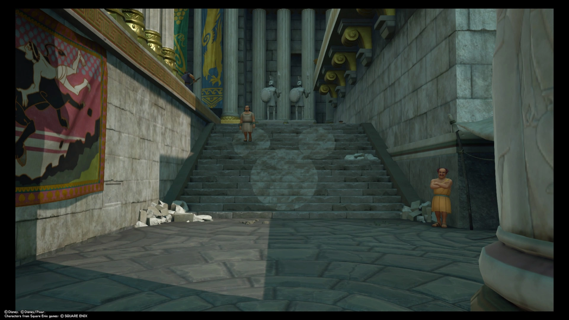 | #3 | Agora, Thèbes Sur des escaliers avec la différence de couleurs, à côté de la tapisserie d'un homme attrapant un taureau dans le dos de la statue d'Hercule. |