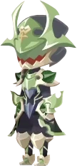 Son armure est de couleur verte, décorée du Symbole de Maîtrise doré sur son front. La visière de son casque forme une bouche dentelée, et ses ailettes divergent, les pointes supérieures se rejoignant presque au sommet de son crâne alors que les points inférieures sont presque à l'horizontale.