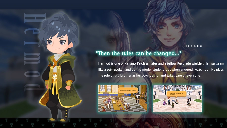 Hermod est un personnage introduit dans Kingdom Hearts: Dark Road. Il est l'un des camarades de la classe de porteurs de Keyblade dont Xehanort fait partie, et l'accompagne dans son voyage.