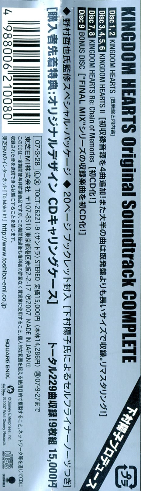 Kingdom Hearts Original Soundtrack Complete est une compilation de 9 disques comprenant toutes les musiques de Kingdom Hearts, Kingdom Hearts: Final Mix, Kingdom Hearts II, Kingdom Hearts II: Final Mix et Kingdom Hearts: Re:Chain of Memories.