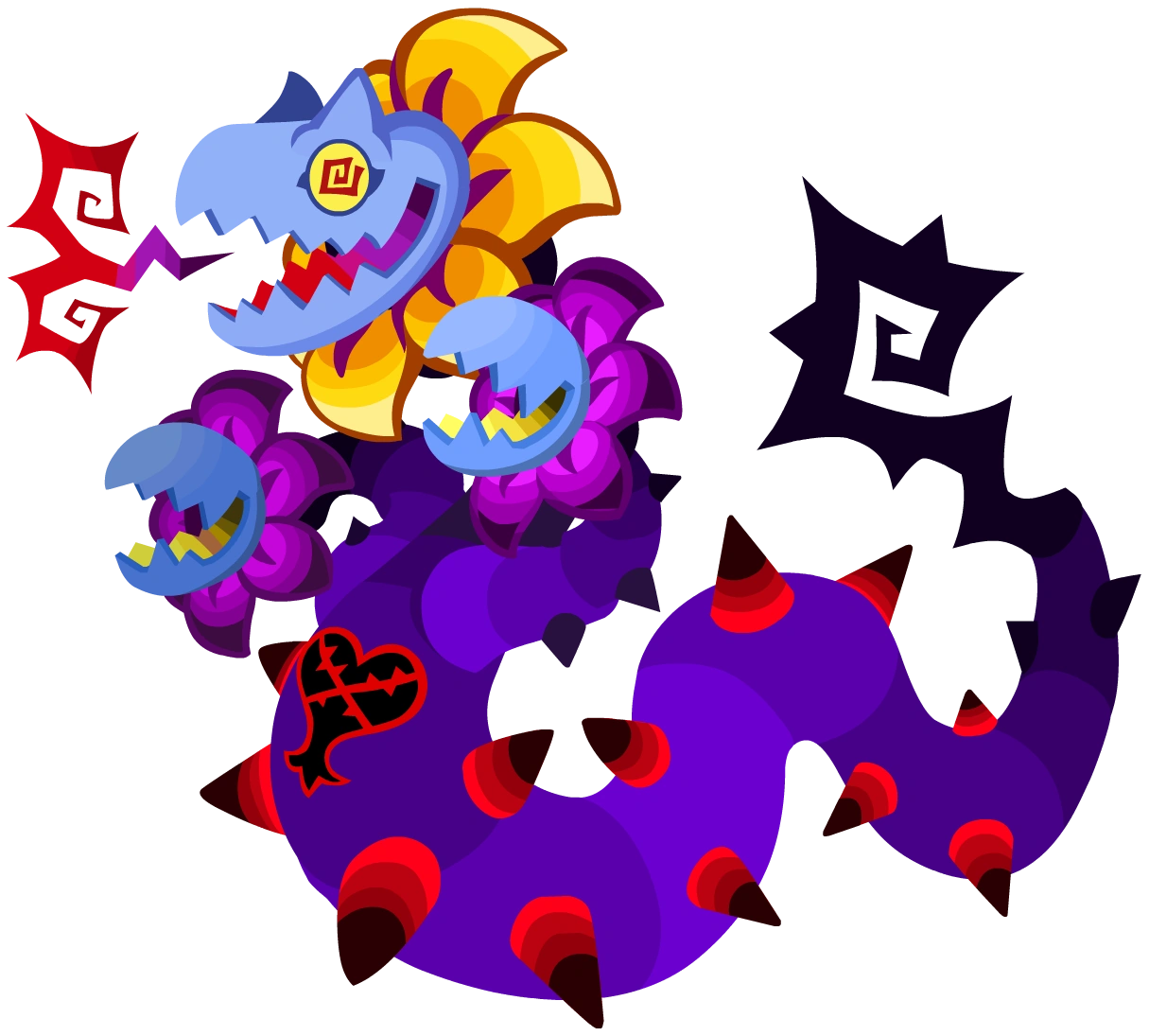 Le Thorned Snake ressemble à un serpent, dont le corps est formé d'une ronce violette à pointes rouges. Il possède trois têtes, chacune entourée d'une collerette rappelant les pétales d'une fleur.