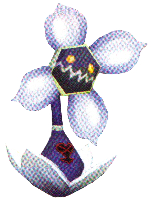 Its mouth is jagged and its eyes are glowing yellow. Its face is decorated by four white flower petals with blue-white edges. A yellow-green band separates the upper body from the lower body. The Heartless emblem is emblazoned on the lower half of its body.