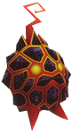 A Fiery Globe is a very small Heartless that is shaped like a molten, rocky sphere. Two glowing, yellow eyes are visible poking through the fragments of rock. Its legs are featureless red spikes that protrude from the bottom of the globe, and a twisted, red antenna sprouts out of the top. Its Heartless emblem is on its back.