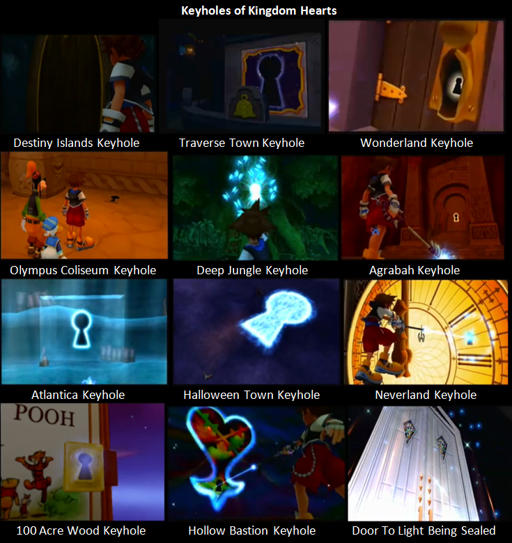 A Keyhole is a gateway in each world that leads to the heart of that world. The Heartless invade worlds and search for their Keyholes (which, not surprisingly, appear as large keyholes). Upon discovering the Keyhole, the Heartless will enter it and eventually devour the world's heart. After a world's heart is consumed, the world crumbles, and fades from existence. It is said that if the Keyblade locks a world's Keyhole, it can never be opened again.