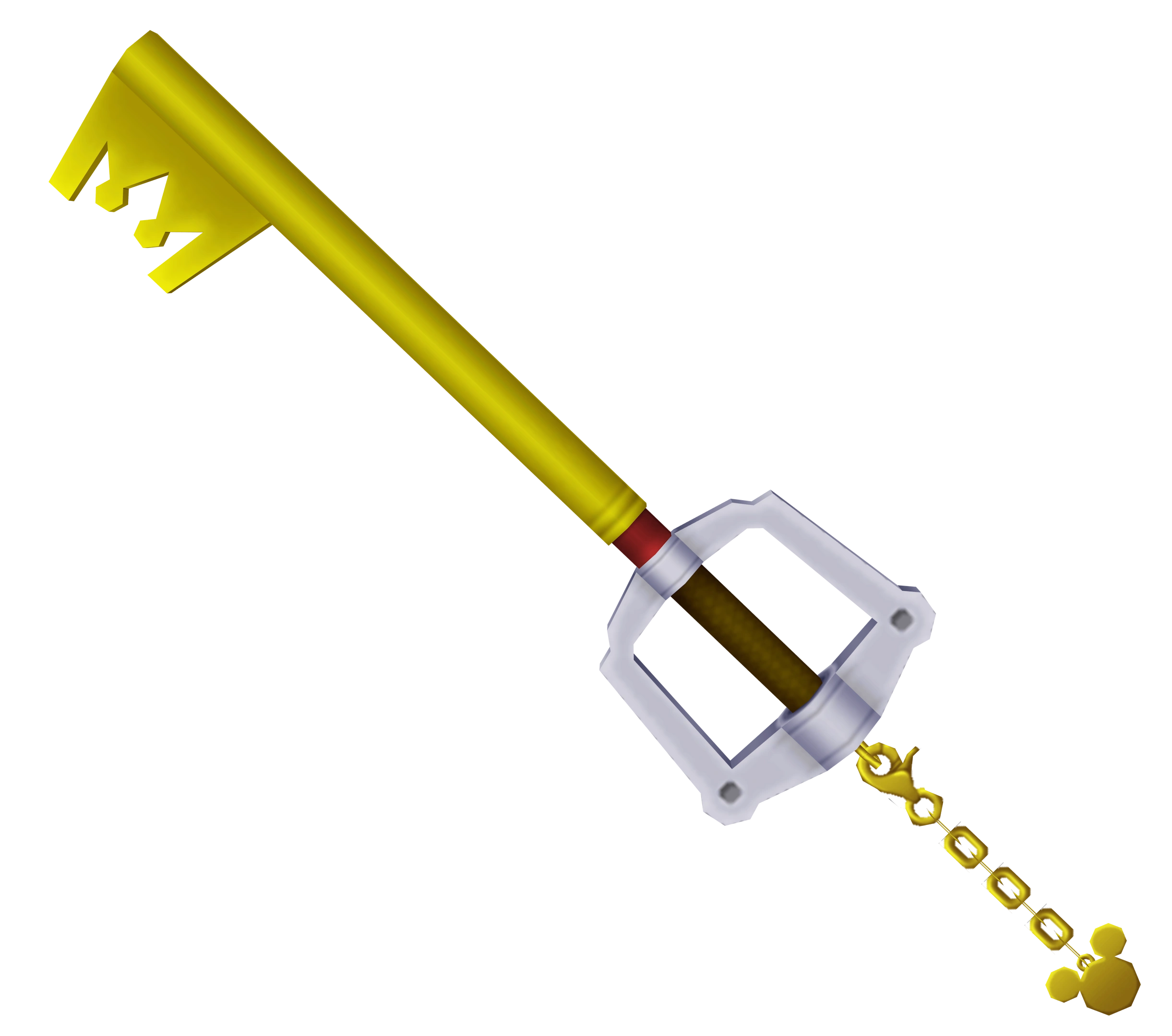 The Kingdom Key D is an exact reverse/mirror image of the traditional Kingdom Key and this purpose is reflected in its coloration - where Sora's Keyblade is silver with a gold cross-guard and silver chain, Mickey's Keyblade is gold with a silver cross-guard and gold chain. Even the rainguard, which is blue on Sora's Kingdom Key, is red on Mickey's, although both Keyblades possess a dark-colored handle.