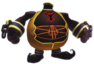 The Kingdom Hearts Final Mix version of the Large Body has a more muted color scheme that echoes that of the Air Soldier. Their skin is now black and their clothing has changed to brown with orange lacing and dull gold trim.