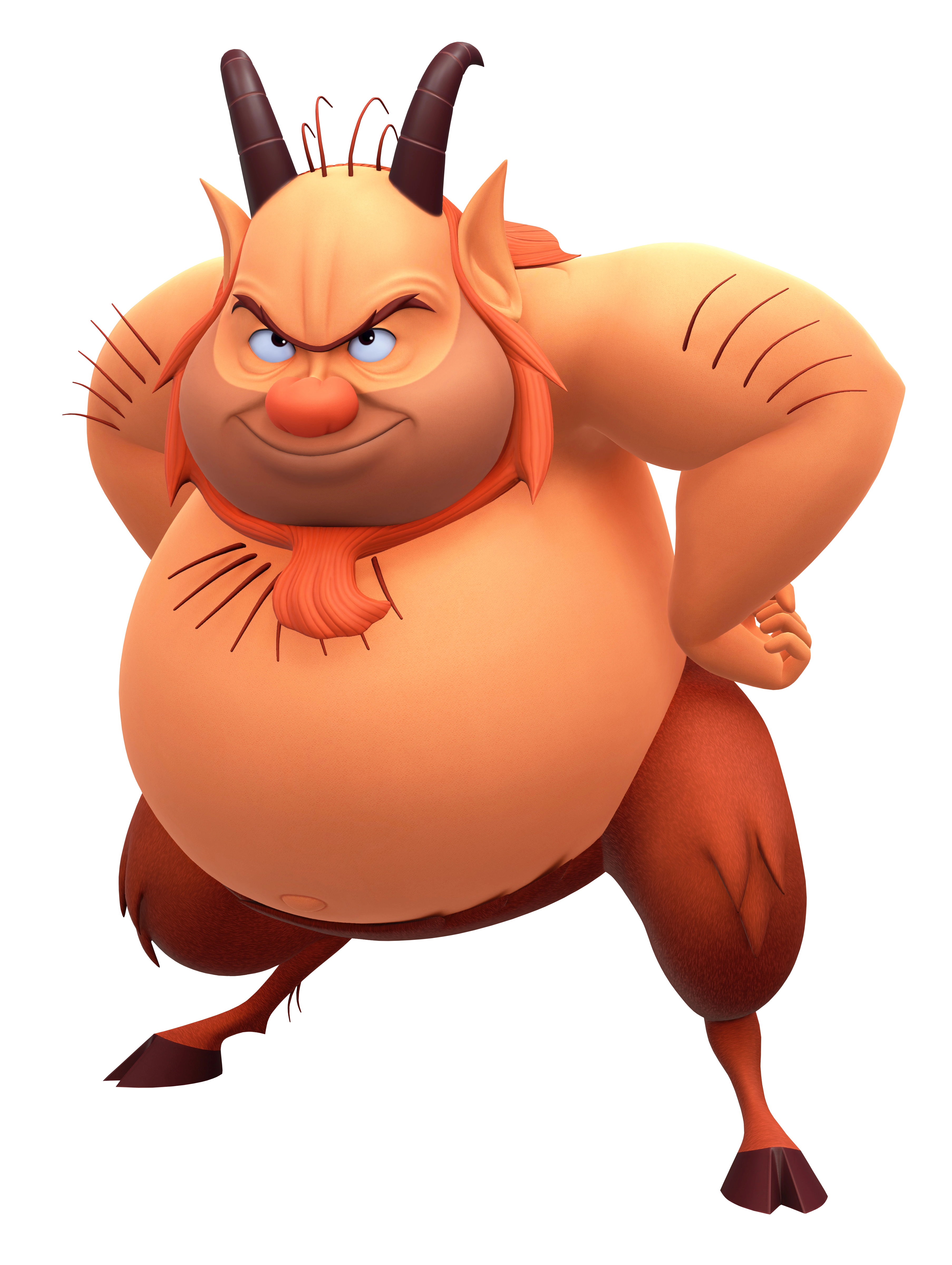 Phil, being a satyr, has the lower body is that of a goat with orange fur and brown hooves. His upper body is that of a short man with an enormous gut and some hair on his chest and arms. The top of his head is bald, save for four strands of orange hair, while the back of his hair is about shoulder-length. He has a curly goatee and five o'clock shadow over most of his lower face. His nose is pink and bulbous, and his ears are pointed. Phil has black eyes and a thin, brown uni-brow. Finally, there are two brown goat horns sprouting out of the top of his head.