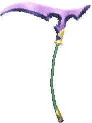 The Poor Melissa has a curved, green handle with a small, pale gold section at its base and a flat, purple pommel. The front blade of the Scythe curves downward slightly and has a circular section taken out of it near the shaft. The back blade is much shorter and curves upward slightly. The weapon’s whole blade is lilac-colored with purple edges. The base of its shaft is pale gold. This Scythe and the Fickle Erica are nearly identical to each other, but have different color schemes.