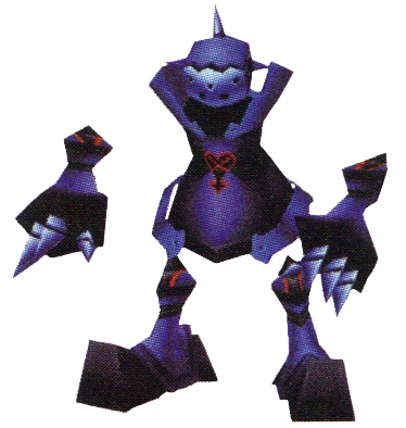 The Heartless emblem is emblazoned on the center of the armor. Its head is light indigo, spherical, and sports three silver spikes and a silver faceplate with several holes in it. Both of its hands are indigo with wide wrists and three silver, segmented fingers. Its legs are short, indigo, and ends in large, hammer-like, black feet. All of the pieces of the Powered Armor seem to be hollow.