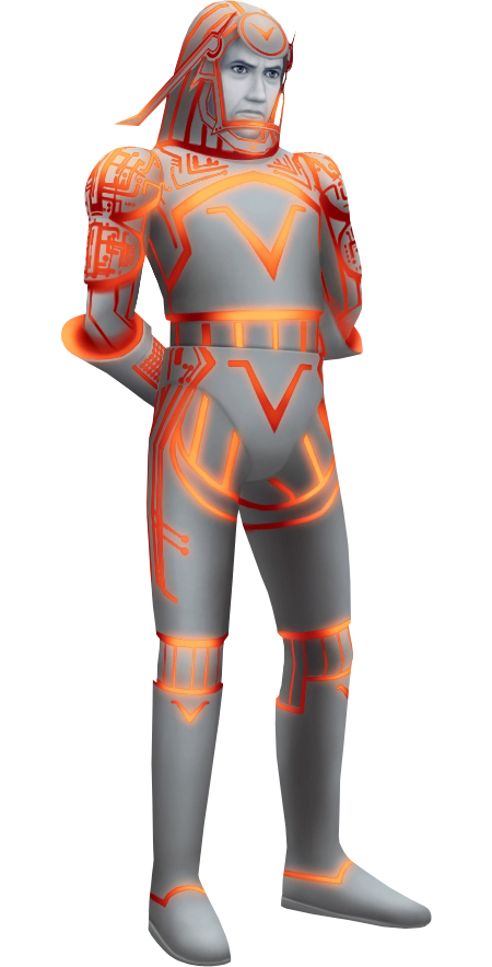 Sark, like Tron, appears to be a grey-skinned human male under his armor (which is also grey). His armor is similar to Tron's, with minor differences, the most notable being the fact that the circuitry patterns are red and glow orange, as opposed to Tron's blue ones that glow cyan. The circuitry on Sark is also much more complex than Tron's and sports a "V"-shaped symbol in several places.