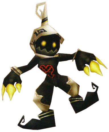 A Sergeant is a large, humanoid Heartless with black skin. It has large hands with yellow claws and wears tattered, black boots with curled toes. It also wears silver bracelets and white knee guards. Its pitch-black head and glowing yellow eyes are visible under its white helmet, which is decorated by a curled antenna and two angular, black spirals. The Heartless emblem is emblazoned on its chest.