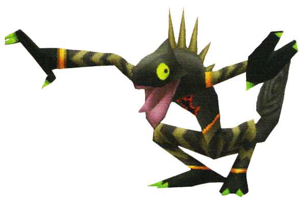 The Veil Lizard is a large, bipedal lizard resembling a chameleon. It has a dark green body, with five tan spikes along its back. It often stands hunched over, holding its arms out in front of it. Its arms and legs sport zig-zagging stripes that alternate from tan to a dark green, with gold bands at the shoulder, wrist, hip, and ankle.