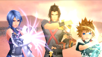 Ventus appears during Sora's visit in The World That Never Was. When Sora sees visions of Kairi and Riku, they turn into Aqua and Terra. Sora then turns into Ventus and when Aqua and Terra turn around Ventus tries to reach them, but they disappear.